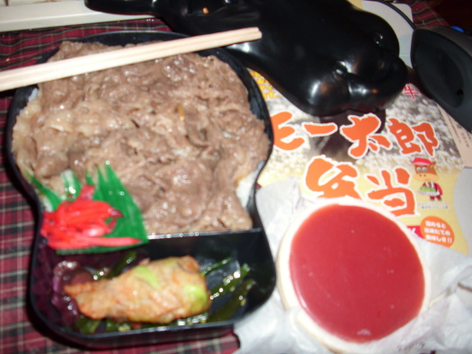 | 帰りに、JR松阪駅まで出て、モー太郎弁当を購入。これが本当に美味かった。国産黒毛和牛肉を、どーんと喰った感じを味わえる。 ただ、弁当箱がリアルな牛の顔面というのが少し難点。せっかくモー太郎というマスコット・キャラクターが有るのを活かしてくれれば。 すき焼きに近い味付け。他の種類の駅弁も次回松阪を通過したときには食べてみたい。 赤い丸は、「老伴(おいのとも)」という菓子。これも松阪名物。 モナカの香ばしい食感と、シャリ感のある糖化した紅羊羹の相性が何とも絶品。 |