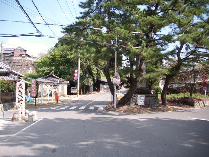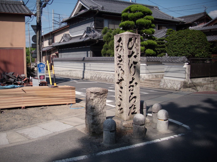 | 「みぎいせみち ひだりならみち」文政13年(1830年)と刻まれている。 材木が置いてある場所に鍵屋という茶店があった。 |