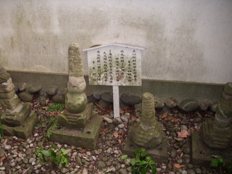 | 【祐傳寺】 築山殿墓 『岡崎東泉記』に、「御袋様は四十間北に神明を勧請申奉」とあるのは、 この墓(供養塔)の事ではないだろうか。 ここに廟を建てて築山殿を祀っていたが、 正保3年(1646年)に水野忠善によって、掛山(欠山)へ移されたとあり、 その跡地に供養塔を建てたものではないだろうか。 |