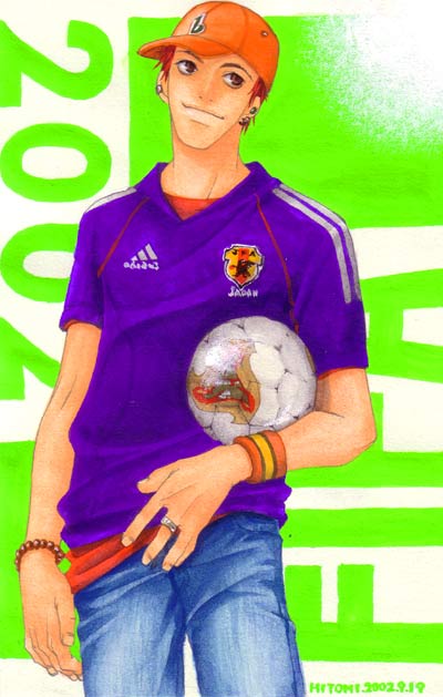 FIFA! 2002.9 サッカーワールドカップにケッコウ感動した俺。 皆がベッカムに注目している中、独りアンジョンファンを追っていた俺。 感動した割にはこの絵の制作日が9月な俺。 手を抜いたのでバックのイエローグリーンがむらになりまくってる俺。