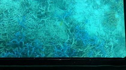 グラスボートで海中、色鮮やかなサンゴや魚が見える
