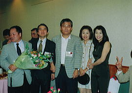 | 刈谷市レスリング連盟会長吉田殿より挨拶 | 監督 乙守殿に花束の贈呈 これからもご指導宜しくお願いします。 |