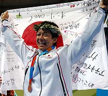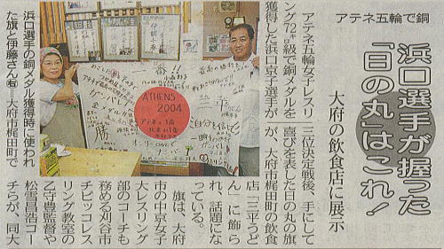 『アテネ観戦での旗 浜口選手旗背負う 大府市三平うどん』 |