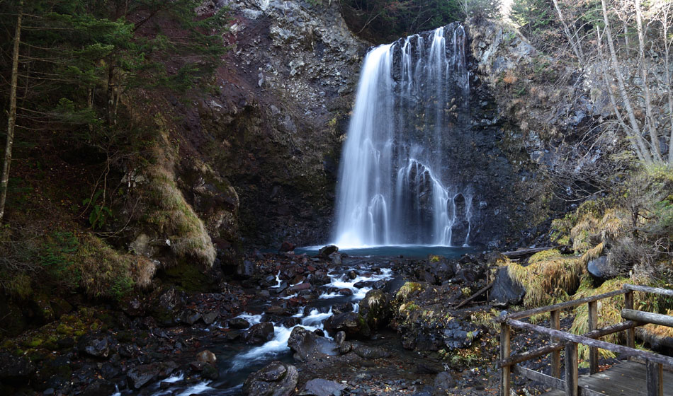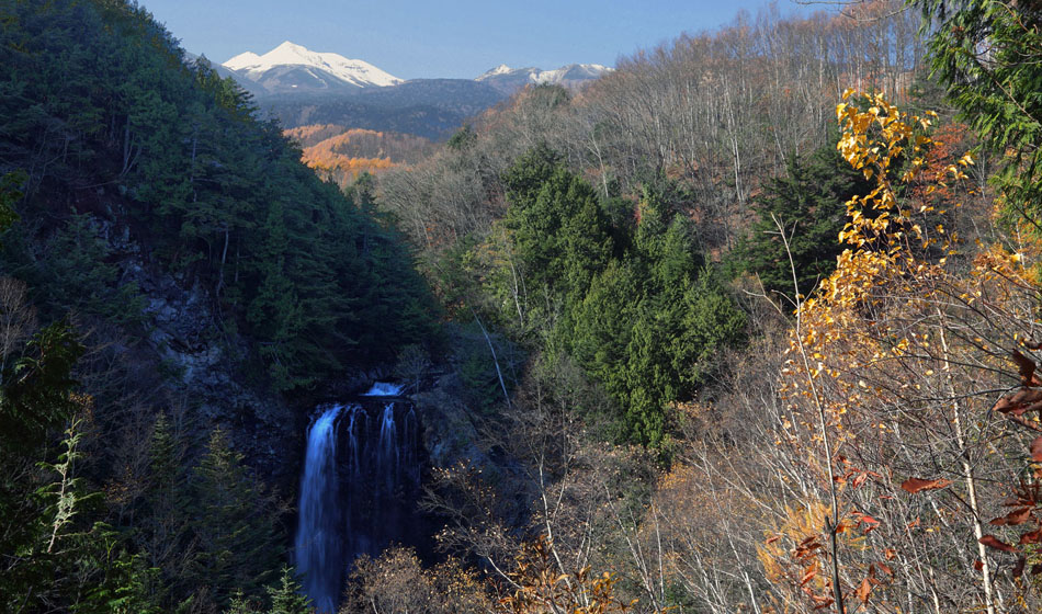 善五郎(ぜんごろう)の滝 落差21.5m 乗鞍岳をバックに雄大です