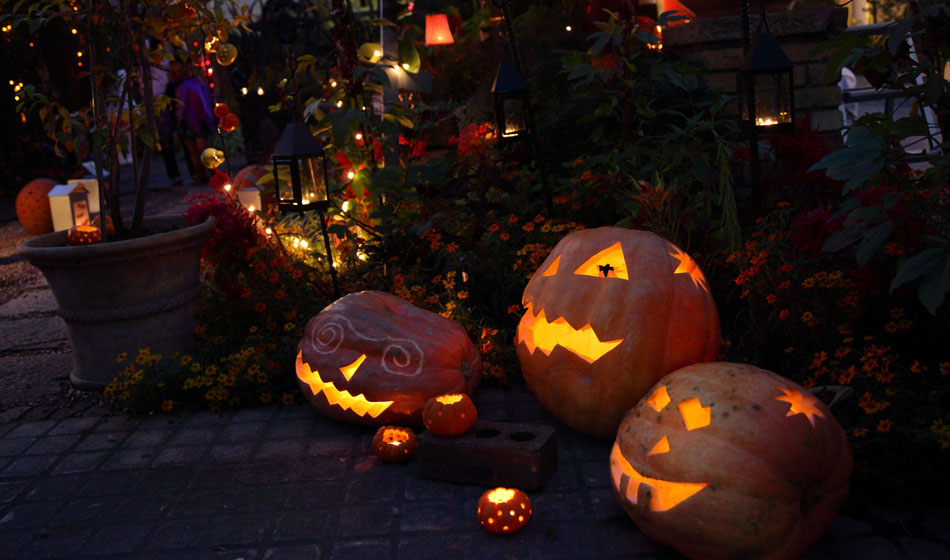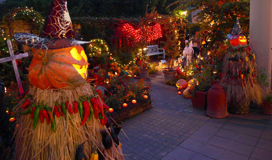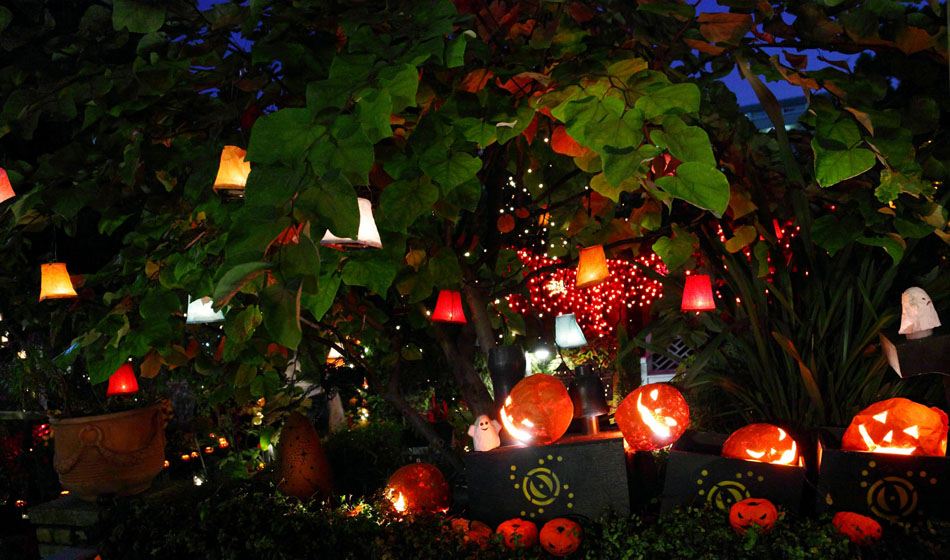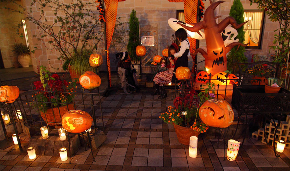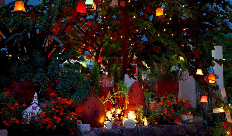 暗くなって庭の飾りの明りがキレイです 白い服の女性は人形ではありませんヨ