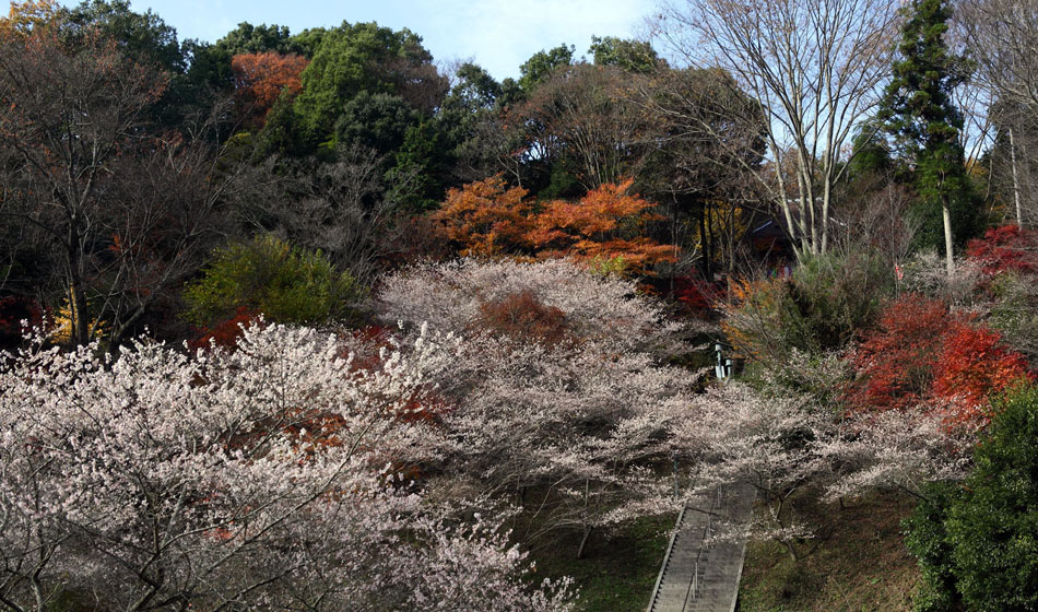 これが公園 ピンクの桜に深紅の紅葉が点在して見事ですネ!