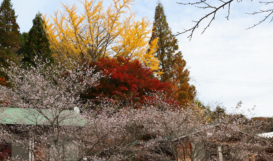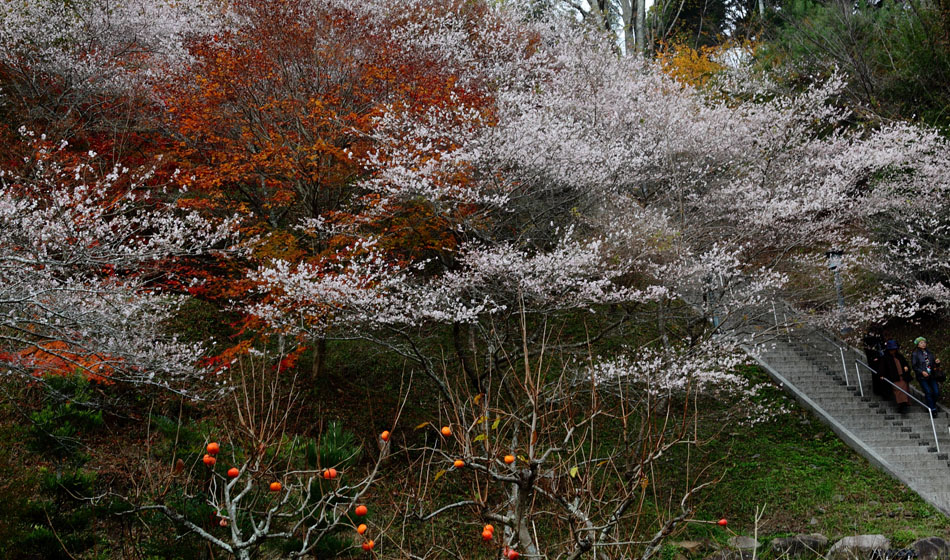ややピンクの濃い桜と紅葉のコラボに柿まで合わせて!