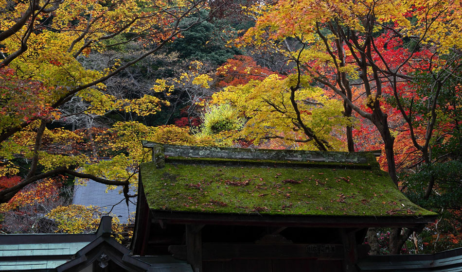 屋根の苔の緑に赤い紅葉 良いですネ!