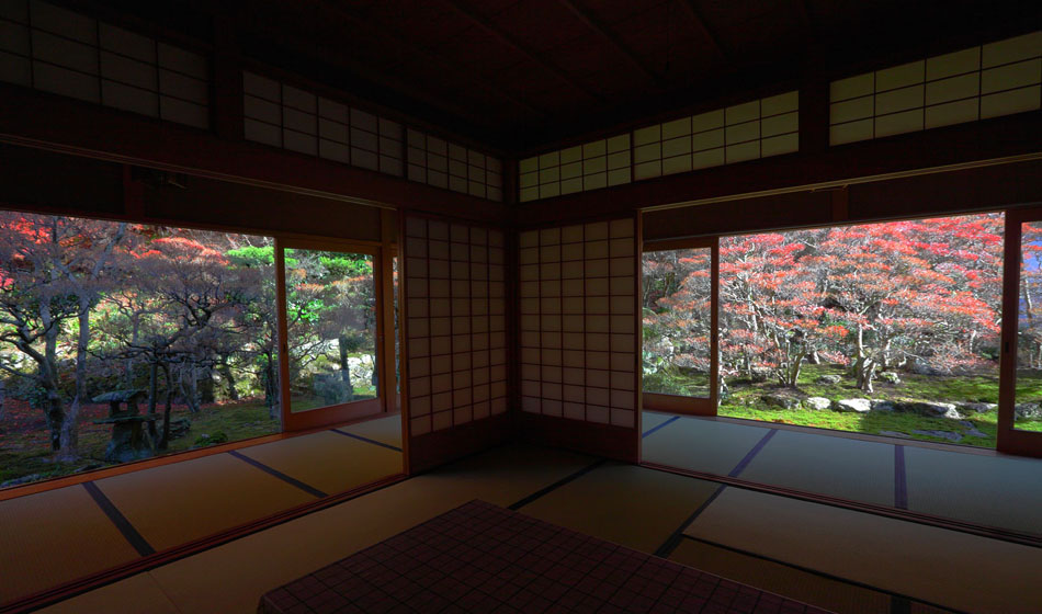 中からの眺めも面白いですネ 左側は畳に赤、右側は緑に染まっています
