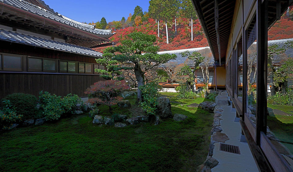 お庭の拝観 杉苔の緑、ドウダンツツジの赤、澄み渡った空の青 良いですネ~