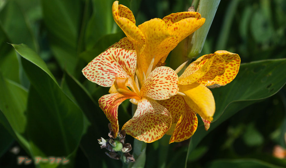 | [カンナ] 2010.07.21 デンパーク 目の覚めるような向日葵色(ひまわりいろ)に斑点ですネ | 2010ホーム 一覧表 ▲前へ ▼次へ |
