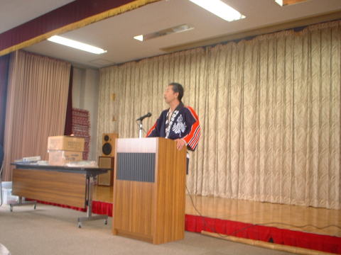地区防災訓練での区長さんの挨拶。昭和19年の東南海地震の体験をもとに地震の怖さを強調。さらに阪神淡路大地震直後に現地入りした体験から、道路や橋が寸断され救助がこない事から、いざ地震となれば自分自身で守らなければならないとあいさつ。 |