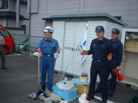 消化器の使い方訓練。消化器は『邪魔だなあ、こんな所に置いて』という場所が最適とか。高価なものなので箱に入れたままという話もままあるそうです。邪魔だから押入れに・・、というのは最悪。くどいですが、今一度点検を。 |