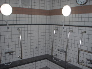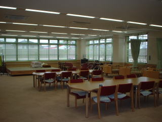 要介護者及び要支援者の皆さんに対し、入浴、食事などの各種サービスを行い、社会的孤独感の解消や心身機能の維持を図ることを目的とした施設。その中心的施設となるデイルーム。 特別浴室。中央にあるのが寝たままシャワーを浴びることができる機械。 一般浴室の洗い場。浴室も洗い場も手すりでいっぱい。手前には据わったまま浴室に入ることができるリフトがあります。