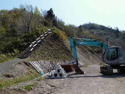 その稜線からいったん階段の道を大きく下ったところで林道に出ます。