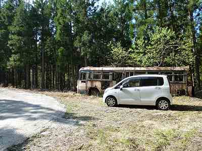 荒れた道をゆっくり10分くらい走ったでしょうか、ネットでもよく紹介されている廃バスがありました。