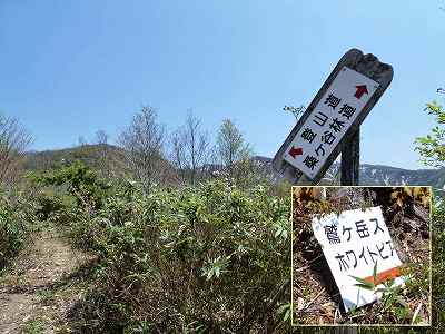 登山道がまばらな雑木林に変わり、やがて鷲ヶ岳スキー場・ホワイトピア高鷲分岐