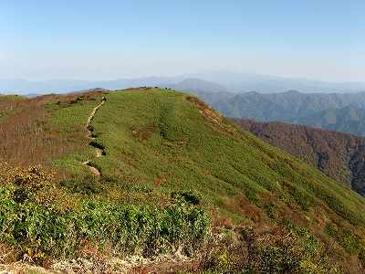 山頂を下りはじめると前方が開けます。正面に姥ヶ岳(うばがたけ 1,454m)、その奥左に 銀杏峯(げなんぽ 1,441m)と部子山(へこさん 1,464m)が見えました。