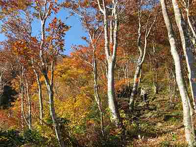 紅葉したブナ林の中の登山道を行きます。