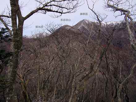 右の高い山が藤原岳の山頂部で、まん中がこれから向かう多志田山、そして 左奥に見えるのが御池岳(1,247m)です。
