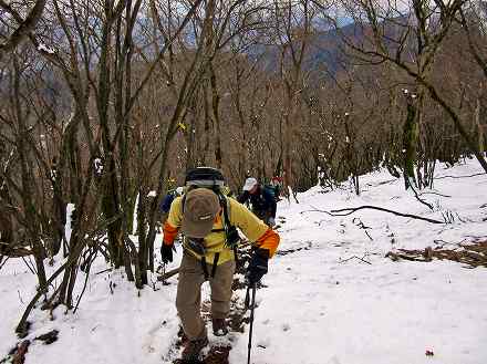 雪で滑りやすくなった急な登山道を登ります。