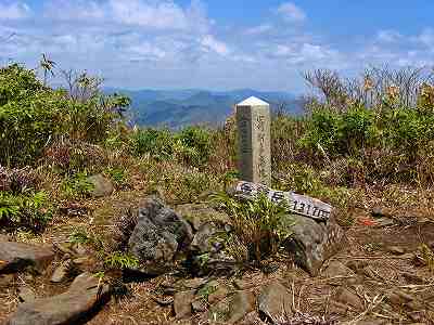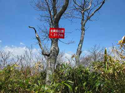 白倉岳山頂はブッシュに囲まれていますが東側は開けていて金糞岳が大きく見えています。