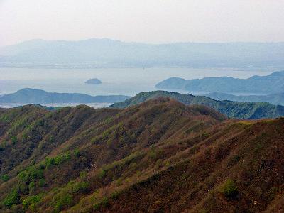 金糞岳から白倉岳の鞍部に向けて下って行くと前方に琵琶湖が一望できます。