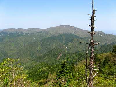 間近に見る平坦な山が銚子ヶ口の山頂部一帯で、 左のピークが北峰、中央が中峰、右端のピークが南峰です。 帰りに北峰にも立寄ってこようと思います。