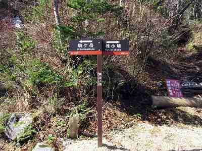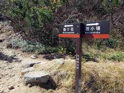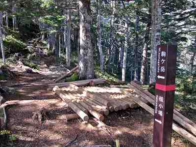 分水嶺の先で分岐があり、西駒山荘ルート・稜線ルートに分かれています。 稜線ルートの方は、《冬道》 となっていますが、景色のいい稜線ルートを行くことにします。 |