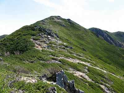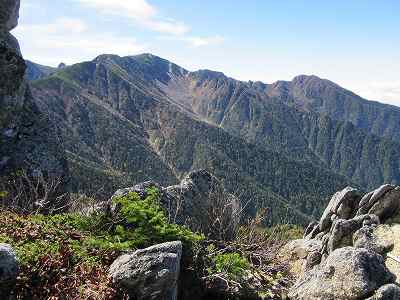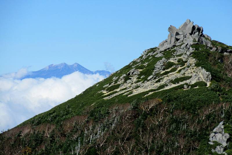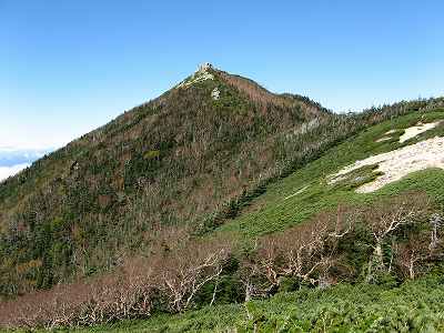 ようやく稜線に出ました。一気に眺望が開けます。 右手北方に見えるのが茶臼山の行者岩(2,658m)です。 |