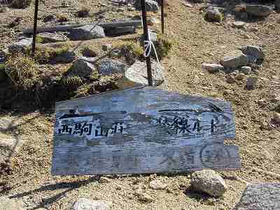 西駒山荘 将棊頭山山頂から眼下に見えている西駒山荘ですが直接下っては行けません。 山頂から南へ5分ほど行ったところの分岐を鋭角に戻るように行きます。 この西駒山荘の石室は学校登山遭難2年後の大正4年に建設されたものだそうです。〔西駒山荘=12:30〕 |