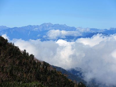 北アルプスもくっきり 行者岩の右手には北アルプスがくっきり見えていました。 穂高連峰の右手には槍ヶ岳の尖った穂先が天を突きます。 |