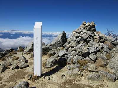 将棊頭山山頂(2,730m) 足の痛みで休みながら登ってきたので分水嶺から35分もかかってしまいました。 先に到着していた馬籠のKさんは25分で登ってきたそうです。 寒いくらいの西風を避け、伊奈側の日だまりで昼食としました。 〔将棊頭山 着=11:35〕 |