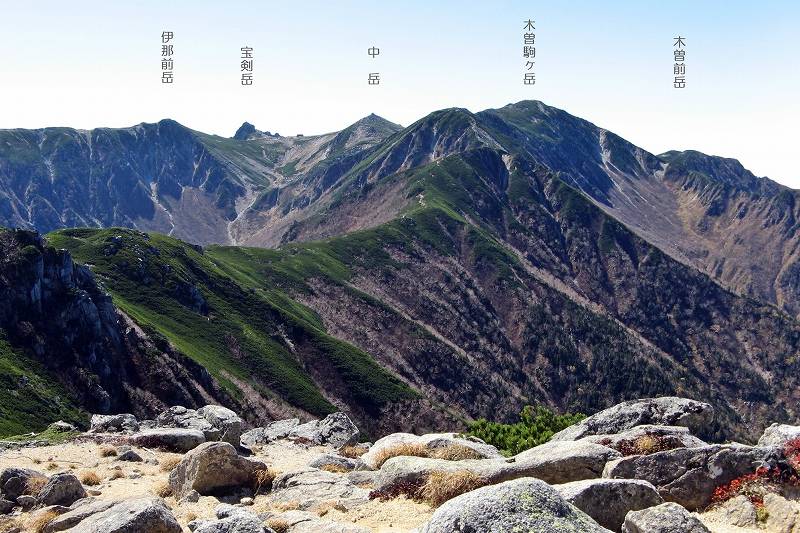 とにかく眺望が素晴らしい将棊頭山山頂でした。 まずは木曽駒。写真左から伊那前岳(2,883m)、宝剣岳(2,931m)、中岳(2,925m)、 そして木曽駒ヶ岳(2,956m)です。 写真手前から続くのは馬の背と呼ばれる稜線です。 |