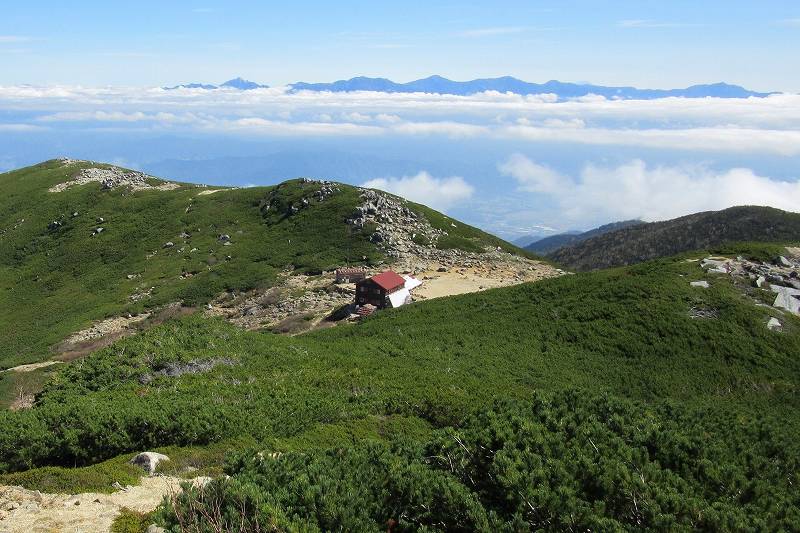 東側のすぐ下に見える赤い屋根は西駒山荘。 その背後、雲海に浮かぶ山並は南アルプスです。 くっきりと見えるので、左の甲斐駒ヶ岳から順に山座同定もできます。 写真ではわかりづらいですが、南アの奥には富士山も見えていました。 いつまでも見飽きない景色ですが行程が長いので下山にかかります。 〔将棊頭山 発=12:20〕 |