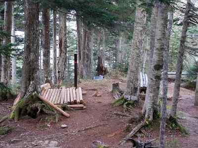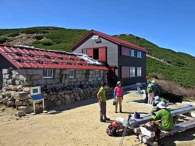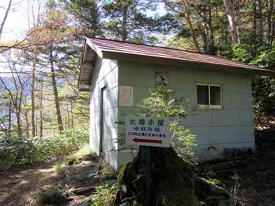 次第に登山道らしくなる道を登っていくと大樽避難小屋が現れました。 しっかりした、比較的きれいな避難小屋で、裏に簡易トイレがありました。 ただ、このトイレは袋回収式で、袋は避難小屋の中に備えられています。 〔大樽避難小屋=8:50~8:55〕 |