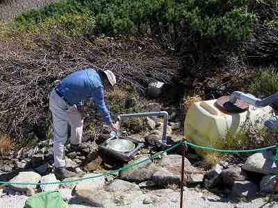 水場 水場は西駒山荘から北へ1分のところにありました。 天命水というそうですが、こんな山頂部にありながら、冷たい水がふんだんに流れ出ていました。 |