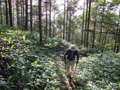 始めはヒノキの林の中、そして尾根道に出るとカラマツ林の道になります。 この先馬返しというところがあるように、馬でも歩ける緩やかないい登山道でした。 |