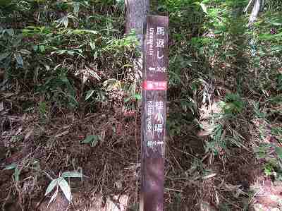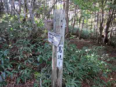 ここまで確かに馬も安心して歩ける道でした。 しかし、ようやく馬返しの案内標識。 馬は返さなければならないので、これから先は歩くしかない ということですね。 ここには北へ向かう分岐があり、奈良井宿へ続く道のようです。 〔馬返し=8:20~8:25〕 |