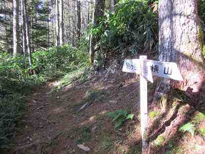 野田場からも緩やかな登山道が続きます。 そして現れたのがこの案内標識。横山道分岐です。 〔横山道分岐=8:10〕 |