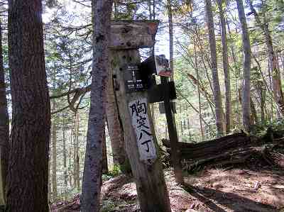 胸突ノ頭から緩やかになった道を行くと行者岩分岐の標識がありました。 茶臼山の行者岩へはこの分岐を右にとりますが、将棊頭山へは直進します。 〔行者岩分岐=10:50〕 |