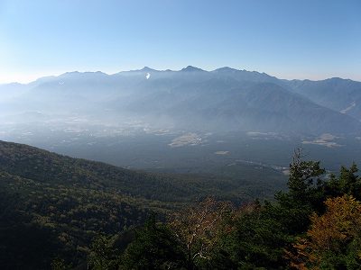 崩壊地南側の眺望 編笠山の右奥にややかすんだ富士山が見えました。 そしてその右には南アルプスの山並です。 鳳凰三山、北岳、甲斐駒ヶ岳、鋸岳がくっきり。 さて、山頂まであと一息。再び樹林帯を登ります。 〔崩壊展望地 発=10:10〕 |