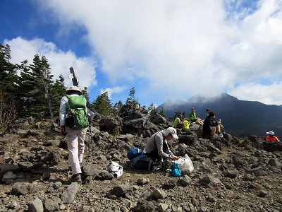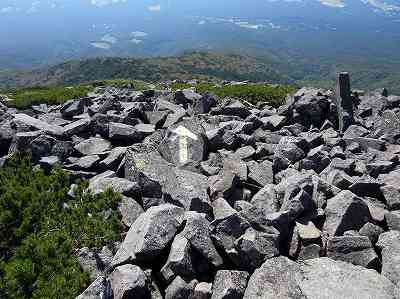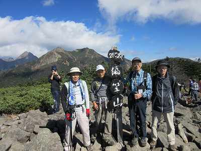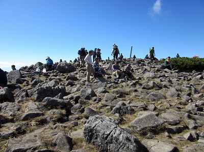 西岳山頂(2,398m)到着 最後は休み休み登りようやく西岳山頂に到着。 すでに10人くらいの人たちが休憩していました。 〔西岳山頂 着=10:20〕 |