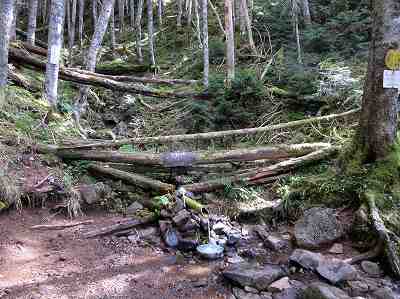 西岳から青年小屋へはいったん下って緩やかに登り返す道でした。 苔むして八ヶ岳らしい雰囲気の中を歩き50分、乙女の水に着きます。 この水は金命水というそうですが、上動清水の長命水と同様冷たくておいしい水でした。 〔乙女の水=11:35〕 |