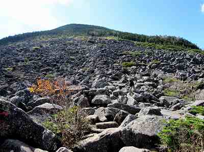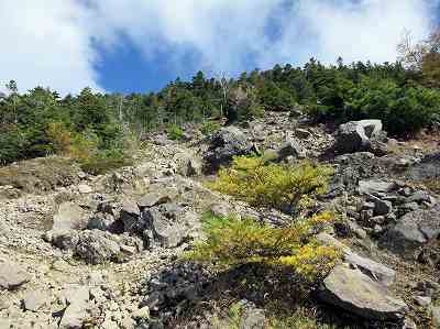 次の一歩を見極めながら下る 平らな岩ばかりならいいのですが、上端がナイフのようになったり、尖っている岩もあって 次の一歩を置く岩を見極めながら下ります。 樹林帯に入ってからも歩きにくい急坂の登山道でした。 途中で小休憩し、2000m付近まで下ってくると少しずつ勾配も緩んできたかなという感じ。 〔2300m付近で途中休憩=13:25~13:30〕 |