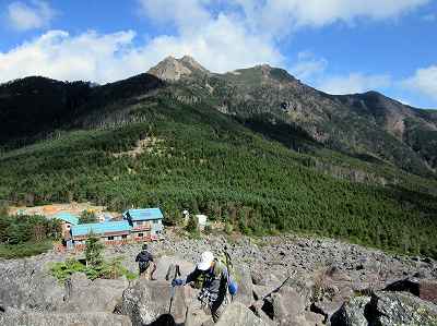 青年小屋から編笠山を見上げます。 ここを登り越えて帰らなければならないので、のんびり遠い飲み屋で過ごす訳にはいきません。 昼食をとって出発します。 〔青年小屋 発=12:00〕 |