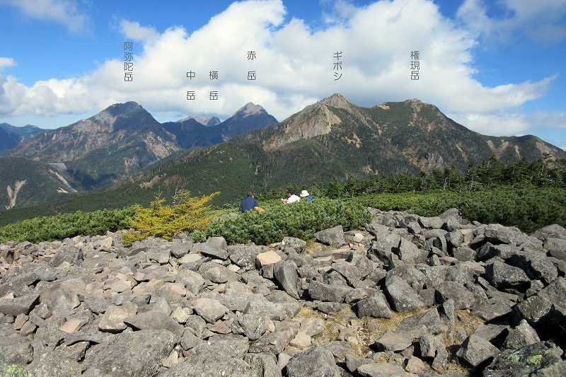 岩に赤丸印や矢印が描かれているので、それにしたがって登ります。 振り返ると眼下に青年小屋。背後には険しい山並が見えました。 中央の尖った2つのピークがギボシ。その右の岩山が権現岳(2,715m)で右の山が三ツ頭(2,580m)です。 〔青年小屋 発=12:00〕 |