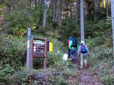 しばらく行くとゲートがあります。その手前に、『熊の目撃情報がありました』 という 看板があったのでそれぞれ熊鈴を付けることにしました。 ゲートから100mくらい行ったところが登山口で、登山届けをポストに投函して入山します。 〔登山口・登山ポスト=7:25〕 |