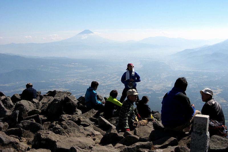 人がいっぱいの編笠山山頂 青年小屋から標高差で150mの急登。休み休みですが30分で登ってきました。 うわー、すごい人! 土曜日だし、天気がいいのでたくさんの人たちが登ってきているんですねえ。 〔編笠山 着=12:30〕 |