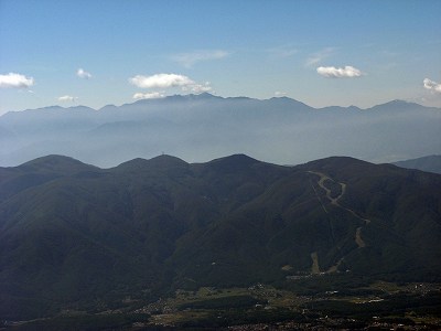 中央アルプスと入笠山 富士山から右へ、南アルプスがあり、そのに西に中央アルプスが見えます。 中央の一番高い山が木曽駒ヶ岳。 手前にハート型模様が見える山が入笠山(1,955m)です。 |